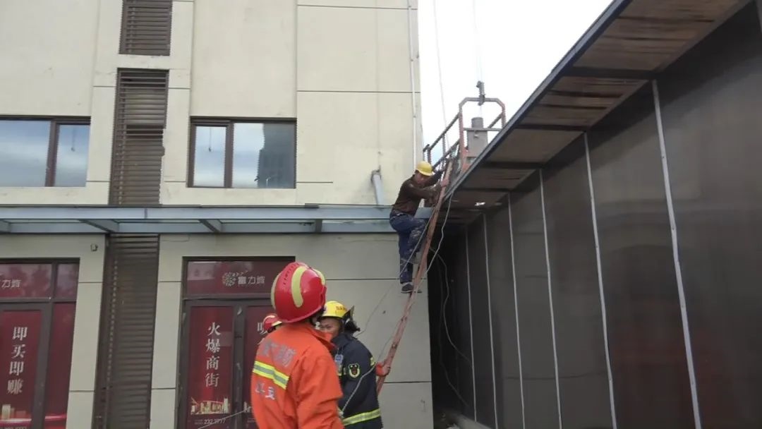 17時(shí)16分,包頭市消防救援支隊(duì)健康路消防站接到指揮中心派警后,立即出動(dòng)2輛消防車、10名消防隊(duì)員火速趕到現(xiàn)場(chǎng)。消防隊(duì)員觀察發(fā)現(xiàn),一名負(fù)責(zé)粉刷大樓外墻的工人被困在公寓外7-8樓之間吊籃中,大顆大顆的冰雹打在他身上,升降機(jī)器鋼絲繩在風(fēng)雨中被纏繞在一起,吊籃無法升降。由于天氣惡劣,風(fēng)速很大,情況十分危險(xiǎn)。