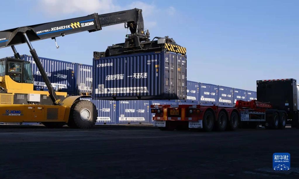 包頭市九原區(qū)“數字陸港”內,吊車從卡車上卸“甩箱”。新華社記者賈立君 攝