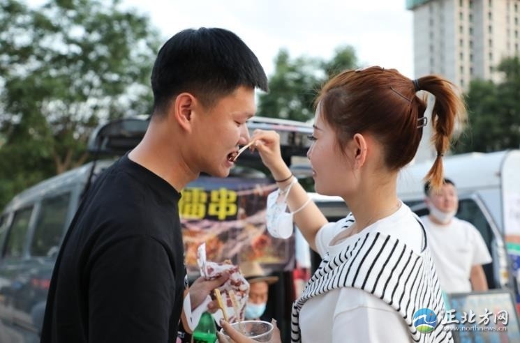 人間煙火氣,最撫凡人心。雖然已是21時許,但是后備廂集市依然人頭攢動,熱鬧非凡,叫賣聲不絕于耳。一家烤腸攤位前,攤主郭浩楠一邊招呼食客,一邊拿著夾子不緊不慢地翻動著烤架上的烤腸,烤好后拿竹簽一穿,伴著滋滋作響的聲音,紅光透亮的烤腸瞬間香氣四溢?!耙呀?jīng)參加了好幾場了,一晚上能售出近百根烤腸,不過我的初衷不是為了賺錢,就是想把自己鐘情的美食分享給大家?!惫崎f。