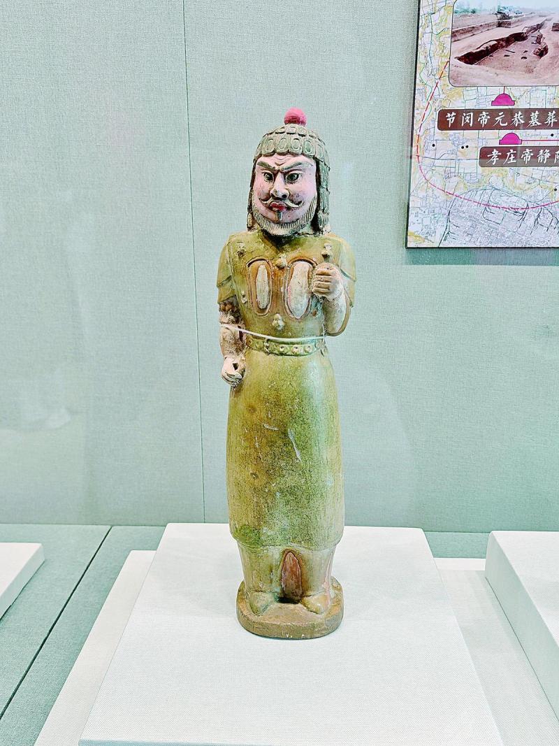 展覽中,呼倫貝爾的嘎仙洞遺址出土的石鏃、骨錐等,見證了拓跋鮮卑早期的生活遺跡;內蒙古博物院藏的鹿角金步搖冠精美華麗,鹿頭面部鑲嵌有珠飾,鹿角支叉上所掛的桃形金葉均可搖動,象征著草原民族對于鹿的崇拜;釉陶馬、青釉武士俑,展示了拓跋鮮卑強大的騎兵力量;從大同出土的彩繪陶女舞俑到洛陽出土的彩繪陶伎樂俑,體現(xiàn)了北魏在漢化改革前后的服飾變化、音樂舞蹈和社會生活。