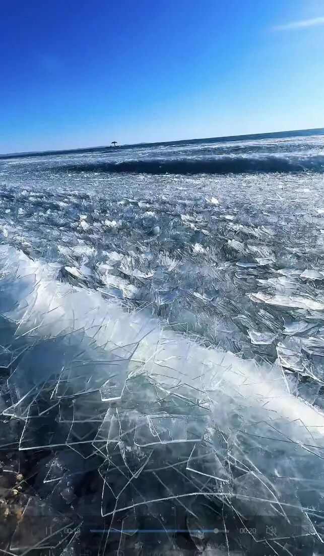 在無(wú)人機(jī)航拍視角下,2239.9平方公里的湖面上,冰排與未完全封凍的水域交織分布,白色冰體與湛藍(lán)湖水相映,宛如大地鋪展的巨型碧玉上鑲嵌的銀紋??拷行牡膮^(qū)域,新凍結(jié)的冰層還呈現(xiàn)出細(xì)膩的冰花紋路,而岸邊的冰排群中,隱約可見因地下泉眼涌動(dòng)形成的“清眼”,表面覆著薄霜,在陽(yáng)光下泛著微光。