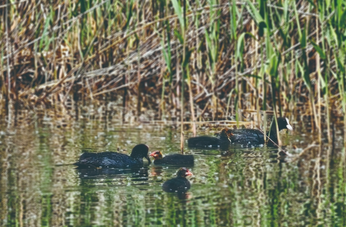 在不遠(yuǎn)處的水域,白骨頂雞一家成為眾人關(guān)注的焦點(diǎn)。幾只剛剛出窩的幼鳥,圓滾滾、毛茸茸的,正好奇地在水中游動,動作略顯笨拙,還不時發(fā)出稚嫩的叫聲。成年白骨頂雞則忙著覓食,它們一頭扎進(jìn)水里,再浮出水面時,嘴里已叼著小魚小蝦,隨后快速游向幼鳥喂食。幼鳥們爭搶食物的場景,充滿了趣味。