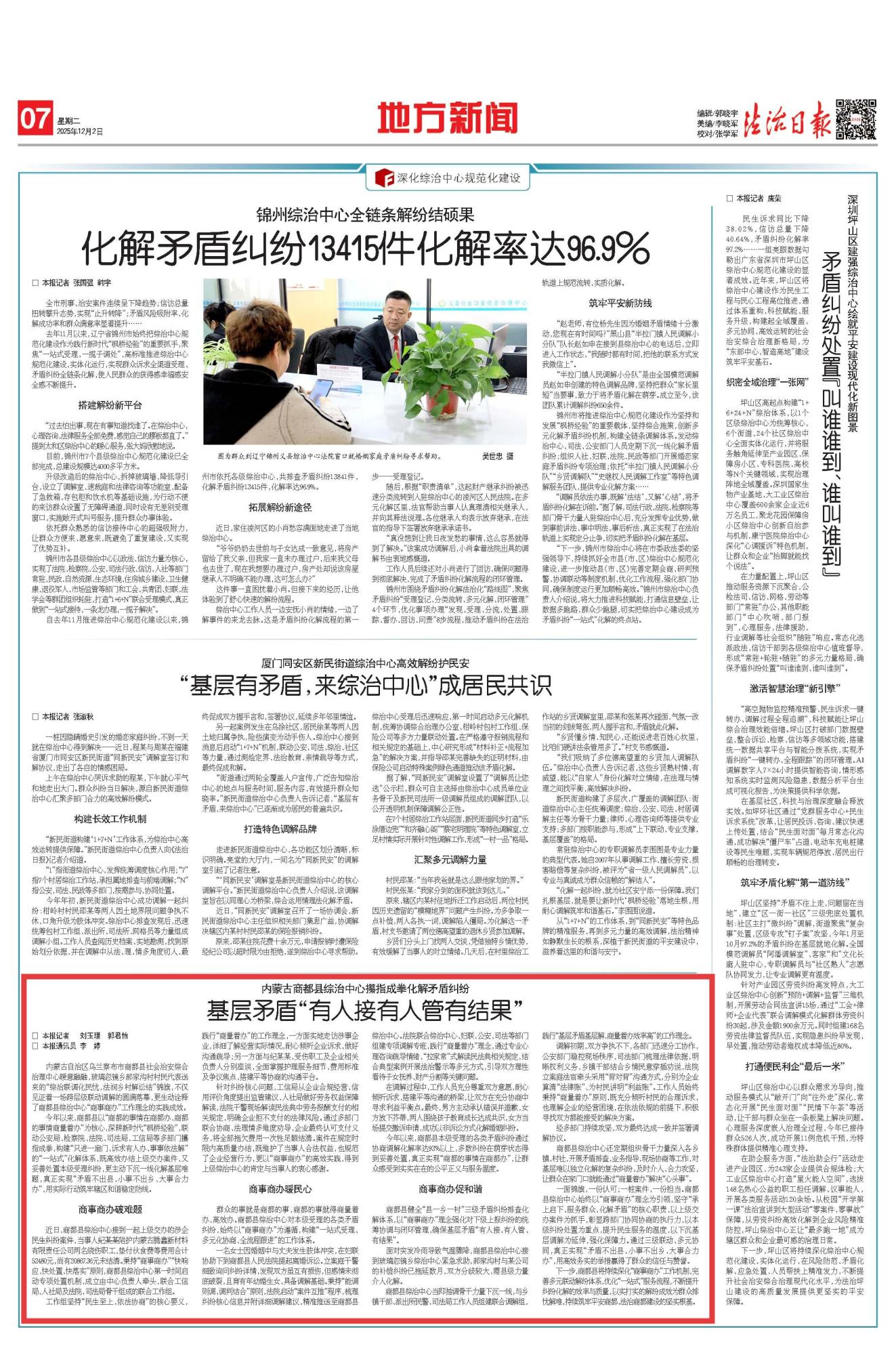 2025年12月2日,《法治日?qǐng)?bào)》第7版刊發(fā)題為《內(nèi)蒙古商都縣綜治中心攥指成拳化解矛盾糾紛 基層矛盾“有人接有人管有結(jié)果”》的文章,報(bào)道了內(nèi)蒙古商都縣以“商都的事情在商都辦、商都的事情商量著辦”為核心,聯(lián)動(dòng)公安局、檢察院、法院、司法局、工信局等多部門攥指成拳,構(gòu)建“只進(jìn)一扇門、訴求有人辦、事事依法解”的“一站式”化解體系,用實(shí)際行動(dòng)筑牢轄區(qū)和諧穩(wěn)定防線。