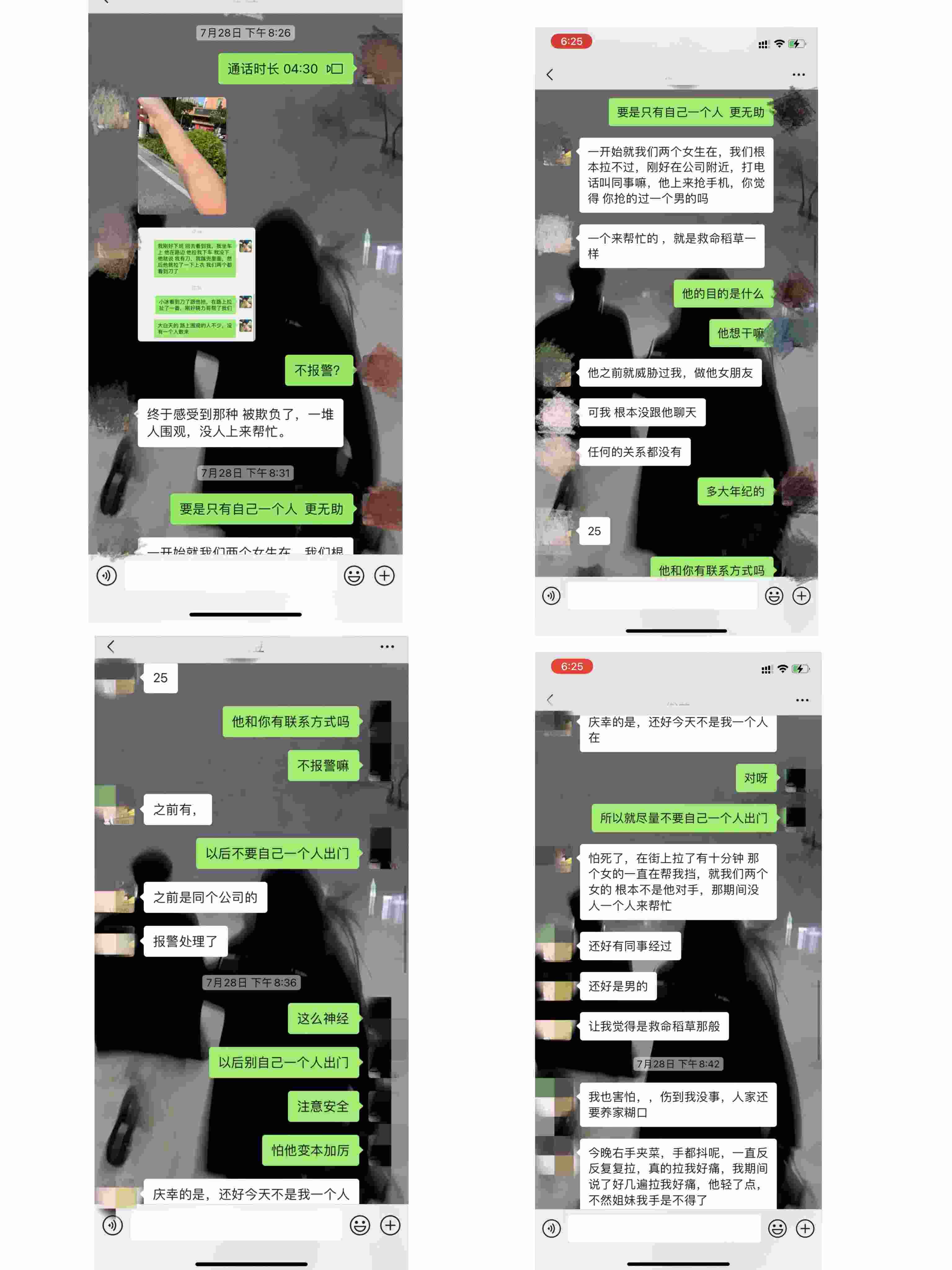 相關(guān)聊天截圖顯示,此次被黃某南威脅后,陳某萍和朋友在微信聊天時(shí)表示,“報(bào)警處理了”。陳某萍還表示,當(dāng)時(shí),黃某南拉她上衣時(shí),她看到了刀,感到非常害怕,幸好有同事出手相助。“他之前就威脅過(guò)我,做他女朋友??晌腋緵](méi)跟他聊天,任何關(guān)系都沒(méi)有。”