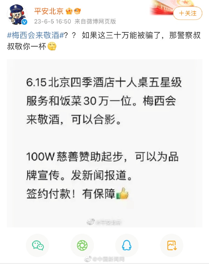 ·30萬(wàn)可讓梅西敬酒?平安北京提醒:別信。