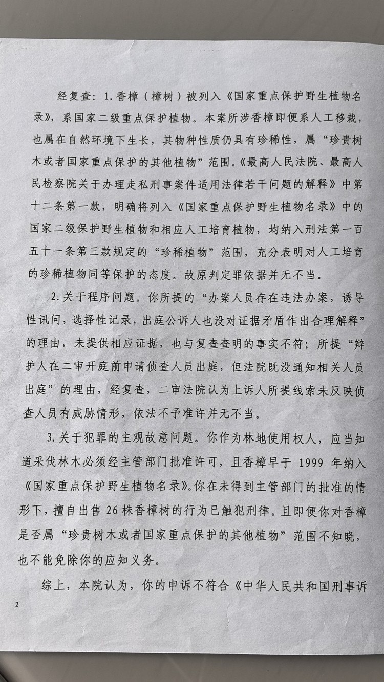 一審判決下達后,馬萬林及謝某林均提出上訴。瀘州市中院在二審時沿用了敘永縣法院一審判決所適用法律規(guī)定,同時認為所砍伐的26棵香樟樹屬于自然環(huán)境內(nèi)生長,即便是人工移栽也未改變自然環(huán)境對香樟成長的決定性影響。香樟樹無論是野生還是人工培育,均未改變其物種性質(zhì),同樣具有珍稀性,系國家禁止、限制出口的珍稀植物,屬于刑法第三百四十條規(guī)定的“珍貴樹木或者國家重點保護的其他植物?!币虼?,馬萬林、謝某林認為人工栽植的香樟不屬于國家重點保護植物的上訴理由不能成立,該院不予支持。