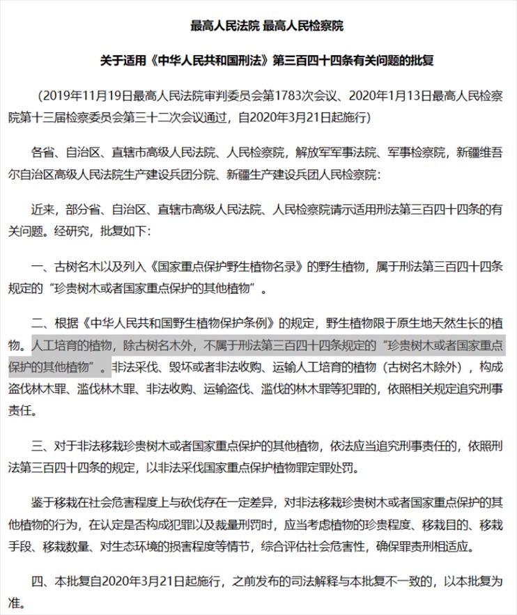 2020年3月,兩高批復(fù)明確“人工培育的植物,除古樹名木外,不屬于刑法第三百四十四條規(guī)定的‘珍貴樹木或者國家重點保護的其他植物’”。圖片來源/網(wǎng)頁截屏