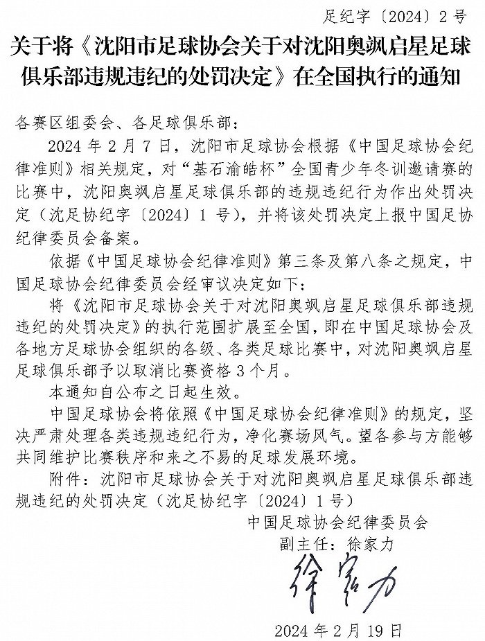 央視網(wǎng)消息:據(jù)中國(guó)足球協(xié)會(huì)2月21日發(fā)布通知,將《沈陽(yáng)市足球協(xié)會(huì)關(guān)于對(duì)沈陽(yáng)奧颯啟星足球俱樂(lè)部違規(guī)違紀(jì)的處罰決定》及《遼寧省足球運(yùn)動(dòng)協(xié)會(huì)關(guān)于對(duì)教練員吳高俊違規(guī)違紀(jì)的處罰決定》在全國(guó)執(zhí)行,具體內(nèi)容如圖: