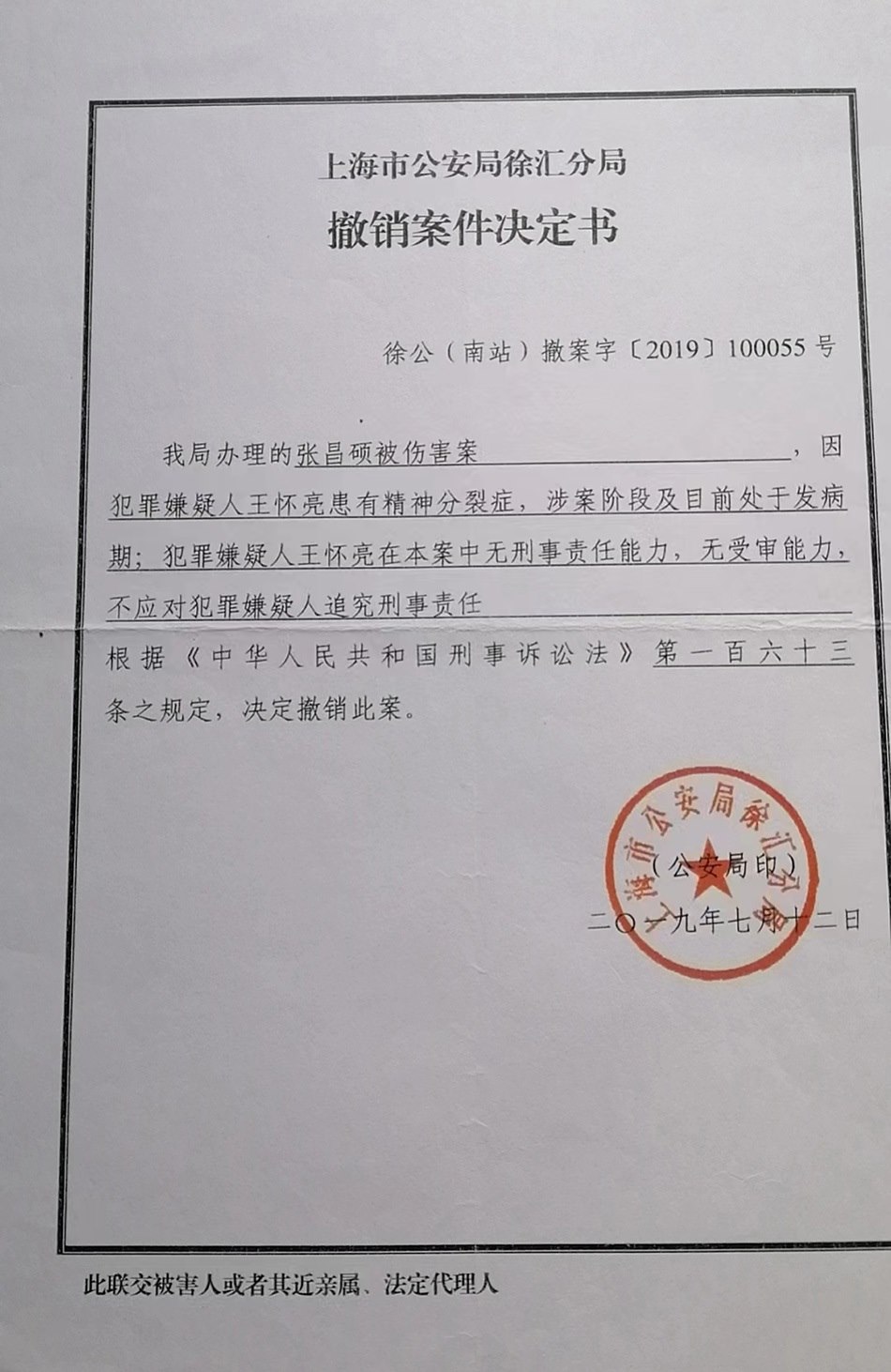 張宏銀回憶,他已經不記得這起依法不負刑事責任的精神病人強制醫(yī)療程序案件開庭審理的具體時間,只記得是2019年下半年的一天上午,那天犯罪嫌疑人沒有到場,律師也沒有到場,檢察院的兩位人員出席了開庭。徐匯區(qū)法院當庭做出判決:王懷亮被送往醫(yī)療機構進行強制醫(yī)療。2019年7月12日,張宏銀收到公安局的撤銷案件決定書。