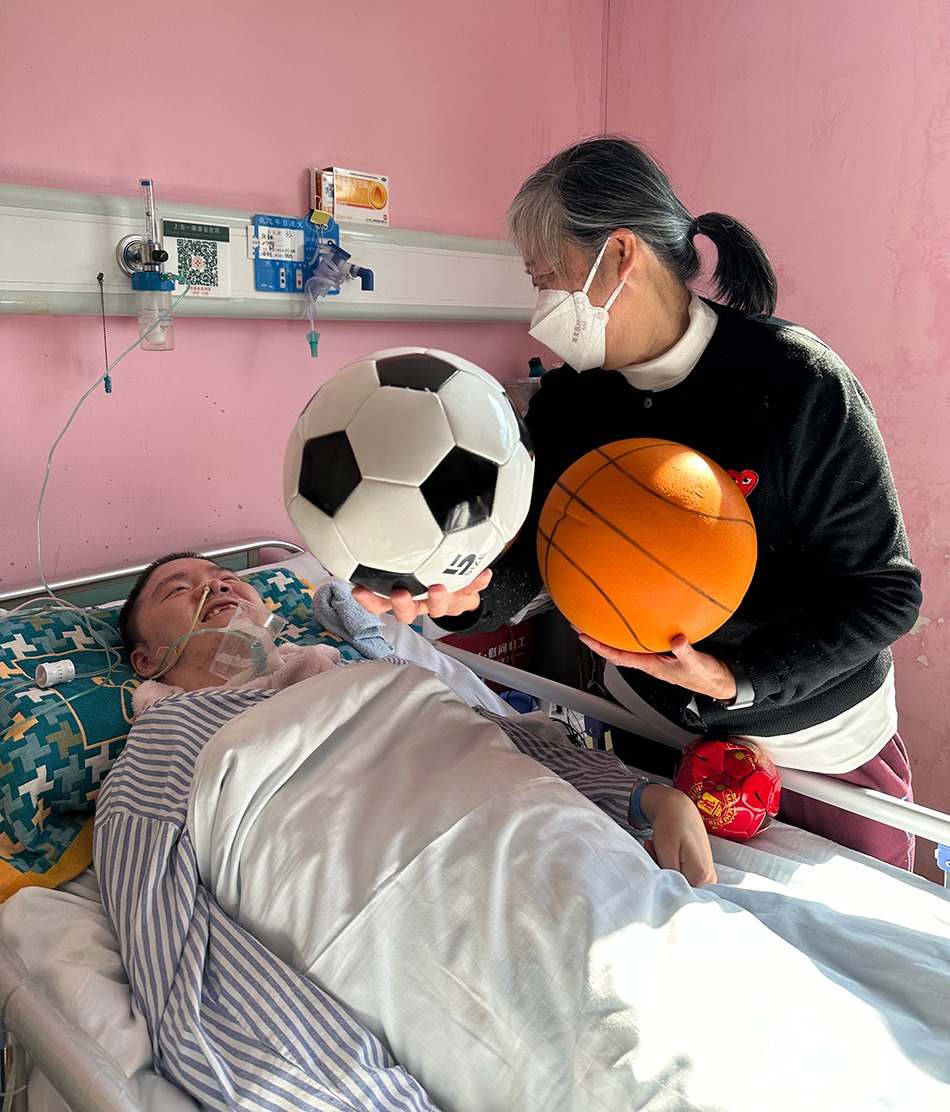 張昌碩恢復微小意識后,鄭建英從家里帶了兩顆昌碩最喜歡的足球到病床前,一大一小。每次,她舉起一顆足球放到他眼前,問他:“哪只是曼聯的?”昌碩的視線會左右移動,選擇正確的那一顆。