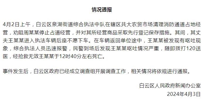 央視網(wǎng)消息:據(jù)貴陽(yáng)網(wǎng)官微消息,4月3日,貴陽(yáng)市白云區(qū)人民政府新聞辦公室通報(bào),4月2日上午,白云區(qū)泉湖街道綜合執(zhí)法中隊(duì)在轄區(qū)共大農(nóng)貿(mào)市場(chǎng)清理消防通道占地經(jīng)營(yíng),勸阻周某某停止占道經(jīng)營(yíng),并對(duì)其所經(jīng)營(yíng)商品采取先行登記保存措施。其間,其丈夫王某某進(jìn)入執(zhí)法車(chē)輛后座不愿下車(chē)。在車(chē)輛返回單位途中,王某某被發(fā)現(xiàn)有嘔吐現(xiàn)象,綜合執(zhí)法人員迅速報(bào)警,民警到場(chǎng)后發(fā)現(xiàn)王某某嘔吐情況嚴(yán)重,隨即撥打120送醫(yī),經(jīng)搶救無(wú)效王某某于12時(shí)40分左右死亡。