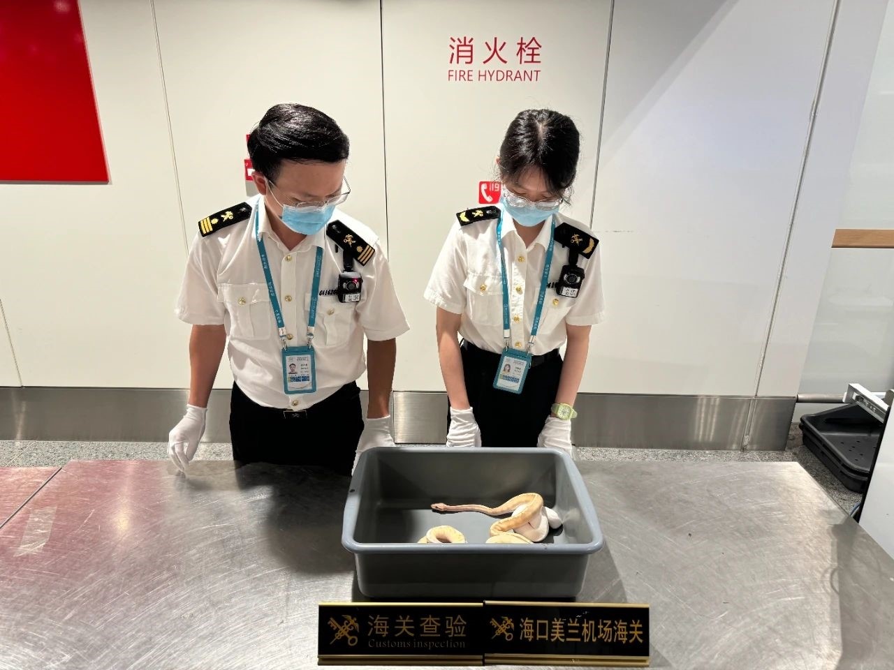 央視網(wǎng)消息:據(jù)“海關(guān)發(fā)布”公眾號消息,近日,??诤jP(guān)所屬海口美蘭機(jī)場海關(guān)在監(jiān)管入境客運(yùn)航班時(shí),現(xiàn)場關(guān)員通過先期機(jī)檢發(fā)現(xiàn)1件托運(yùn)行李圖像存在異常。攜帶該件行李的旅客通關(guān)時(shí)選擇無申報(bào)通道,未向海關(guān)申報(bào)任何物品。經(jīng)現(xiàn)場關(guān)員開箱查驗(yàn),在其行李物品內(nèi)查獲4個(gè)裝有活物的白色布袋,拆開后發(fā)現(xiàn)每只布袋中均包裹有活體蛇類1條,共計(jì)4條。經(jīng)鑒定,這4條活體蛇為球蟒,屬于《瀕危野生動植物種國際貿(mào)易公約》(CITES)附錄Ⅱ列明物種。