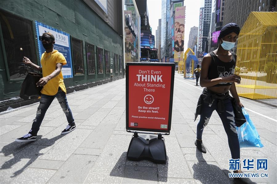 7月23日,在美國(guó)紐約時(shí)報(bào)廣場(chǎng),人們從保持社交距離的提示牌旁走過。美國(guó)約翰斯·霍普金斯大學(xué)23日發(fā)布的新冠疫情最新統(tǒng)計(jì)數(shù)據(jù)顯示,美國(guó)累計(jì)確診病例超過400萬(wàn)例。數(shù)據(jù)顯示,截至美國(guó)東部時(shí)間23日15時(shí)34分(北京時(shí)間24日3時(shí)34分),美國(guó)累計(jì)確診病例4007859例,累計(jì)死亡病例143846例。新華社記者王迎攝