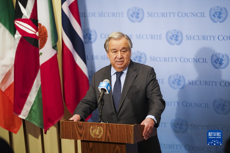 2月23日,在紐約聯(lián)合國(guó)總部,聯(lián)合國(guó)秘書長(zhǎng)古特雷斯在安理會(huì)審議烏克蘭問(wèn)題緊急會(huì)議結(jié)束后講話。 新華社記者 王迎 攝