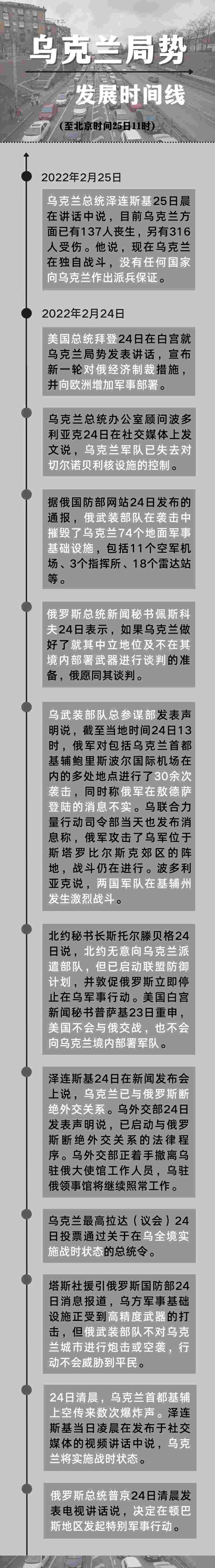 ——烏克蘭總統(tǒng)澤連斯基25日晨在講話中說,目前烏克蘭方面已有137人喪生,另有316人受傷。他說,現(xiàn)在烏克蘭在獨自戰(zhàn)斗,沒有任何國家向烏克蘭作出派兵保證。