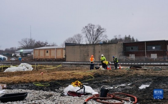2月14日,在美國俄亥俄州東巴勒斯坦鎮(zhèn),工作人員在事故現(xiàn)場附近處理污水。新華社發(fā)(章焱飛攝)
