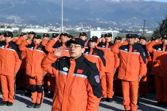 2月10日,中國(guó)救援隊(duì)隊(duì)員在土耳其哈塔伊省安塔基亞市的駐扎營(yíng)區(qū)參加升旗儀式。