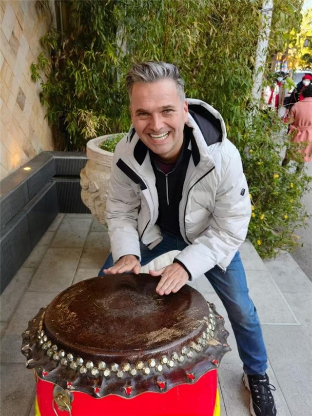 杜安睿在云南昆明街頭嘗試云南鼓。受訪(fǎng)者供圖