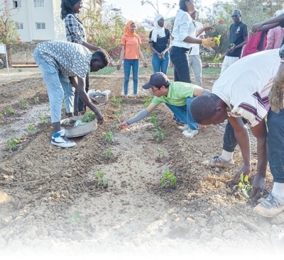 達喀爾大學(xué)校園里,塞內(nèi)加爾學(xué)生跟著中國老師學(xué)習(xí)移栽辣椒苗。中國援塞內(nèi)加爾農(nóng)技專家組供圖