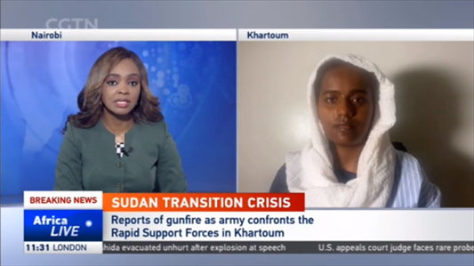 作為國(guó)際傳播的主流陣地,CGTN在蘇丹喀土穆有當(dāng)?shù)貓?bào)道員,事件發(fā)生2小時(shí)內(nèi)即安排報(bào)道員Naba Mohiedeen進(jìn)行電視直播,介紹雙方分歧,更新傷亡人數(shù)和當(dāng)?shù)厍闆r。CGTN成為首批在沖突中心地帶進(jìn)行電視直播的國(guó)際媒體。