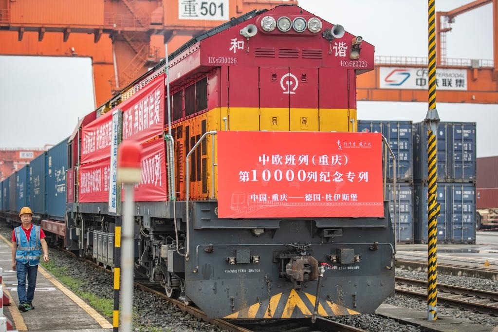 2022年6月23日,在重慶團結(jié)村中心站,鐵路工作人員從中歐班列(重慶)第10000列列車旁走過。當日,第10000列中歐班列(重慶)從重慶團結(jié)村中心站順利駛出,奔赴德國杜伊斯堡。(新華社記者黃偉攝)
