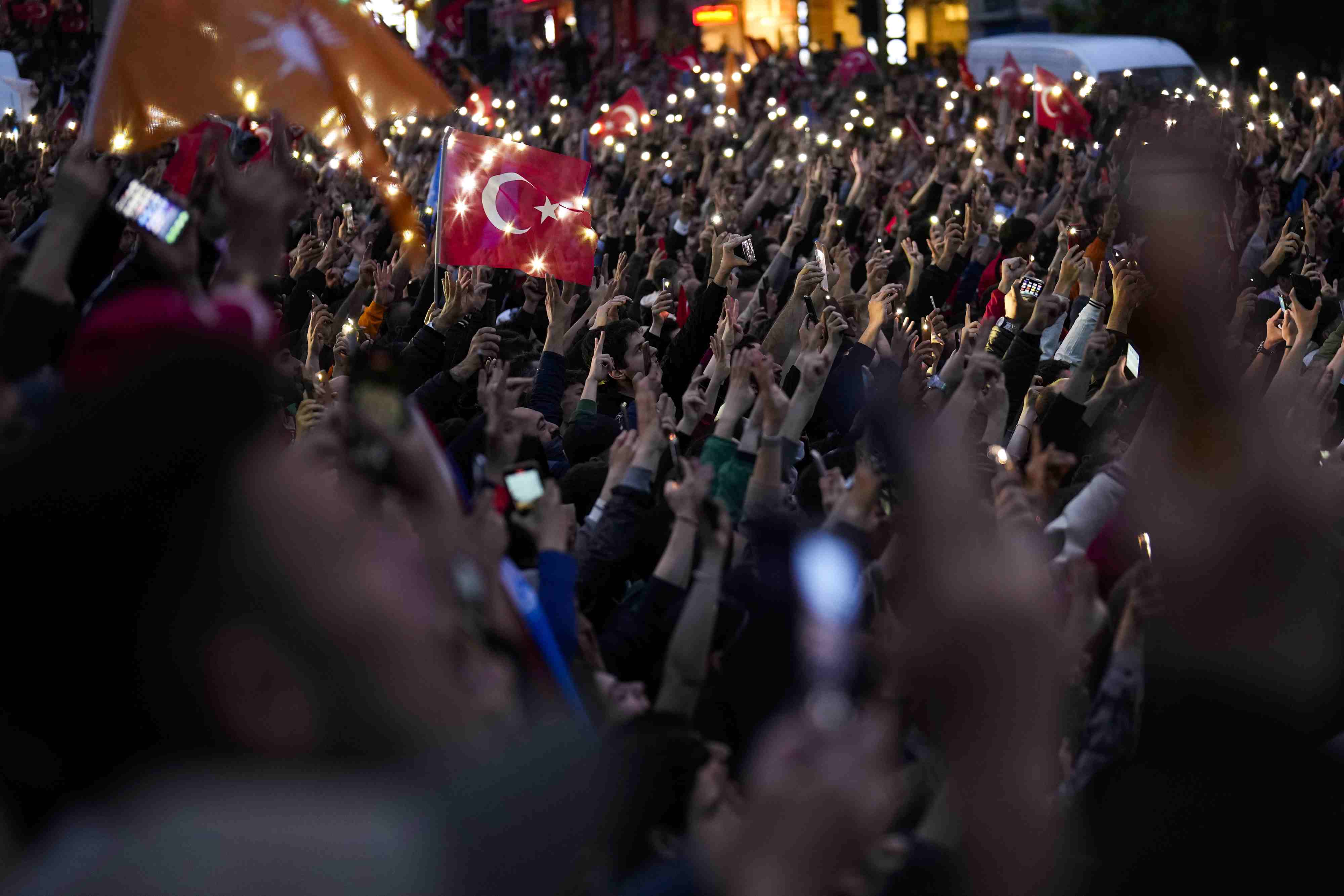 當(dāng)?shù)貢r間2023年5月28日,土耳其伊斯坦布爾,埃爾多安的支持者慶祝其再次當(dāng)選土耳其總統(tǒng)。土耳其最高選舉委員會主席艾哈邁德·耶內(nèi)爾28日深夜在首都安卡拉宣布,根據(jù)初步計票結(jié)果,現(xiàn)任總統(tǒng)埃爾多安在28日舉行的總統(tǒng)選舉第二輪投票中戰(zhàn)勝對手,再次當(dāng)選總統(tǒng)。 視覺中國