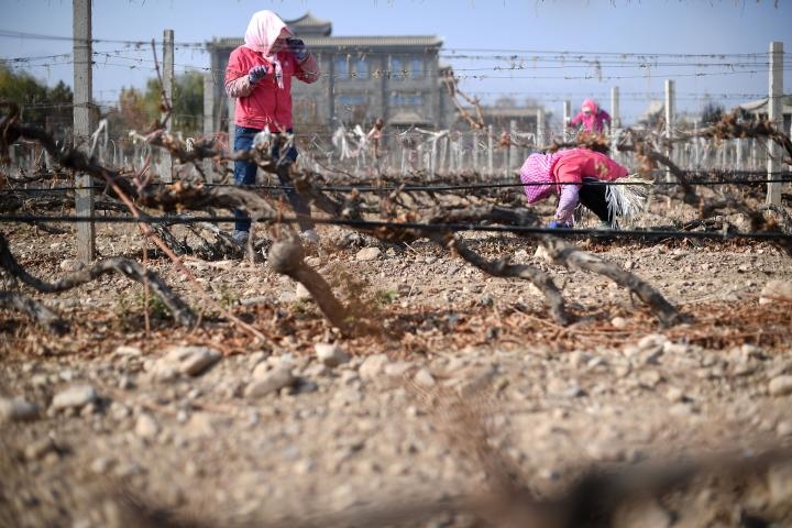 2022年11月5日,在位于寧夏銀川市賀蘭山東麓的藍(lán)賽酒莊,農(nóng)民進(jìn)行埋藤作業(yè)。新華社記者王鵬攝