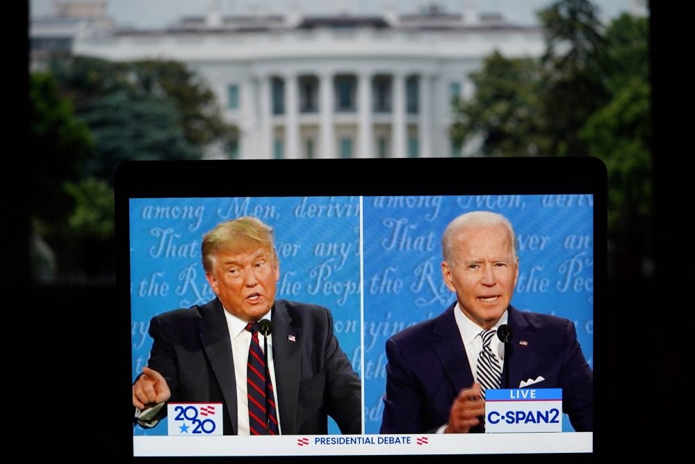 這張2020年9月29日在美國(guó)弗吉尼亞州阿靈頓拍攝的視頻畫(huà)面顯示,時(shí)任美國(guó)總統(tǒng)特朗普(左)與美國(guó)民主黨總統(tǒng)候選人拜登在俄亥俄州克利夫蘭市參加2020年美國(guó)總統(tǒng)候選人首場(chǎng)電視辯論。新華社記者劉杰攝