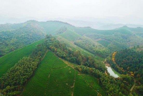 俯瞰浙江省安吉縣魯家村茶園(2018年11月16日無人機拍攝)。新華社記者孟晨光攝