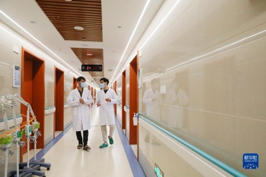 甘肅中醫(yī)藥大學針灸推拿專業(yè)的塔吉克斯坦留學生紀明哲(左)和土庫曼斯坦留學生迪達在甘肅中醫(yī)藥大學附屬醫(yī)院的病房外交流(7月27日攝)。新華社記者 陳斌 攝