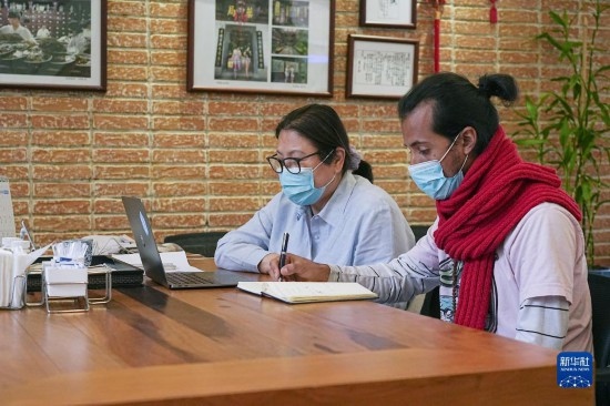 7月27日,在巴西圣保羅,中巴中醫(yī)藥國際合作中心負責人方芳(左)與同事參加視頻會議。新華社發(fā)(保羅·洛佩斯 攝)