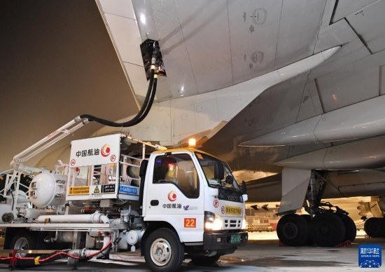 8月1日,在中國鄭州新鄭國際機(jī)場,中國航油華南藍(lán)天河南分公司的工作人員為一架盧森堡貨航貨機(jī)加油。新華社記者 李嘉南 攝