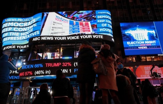 2020年11月3日,人們在美國紐約時報廣場觀看總統(tǒng)選舉實時計票結(jié)果。新華社記者王迎攝