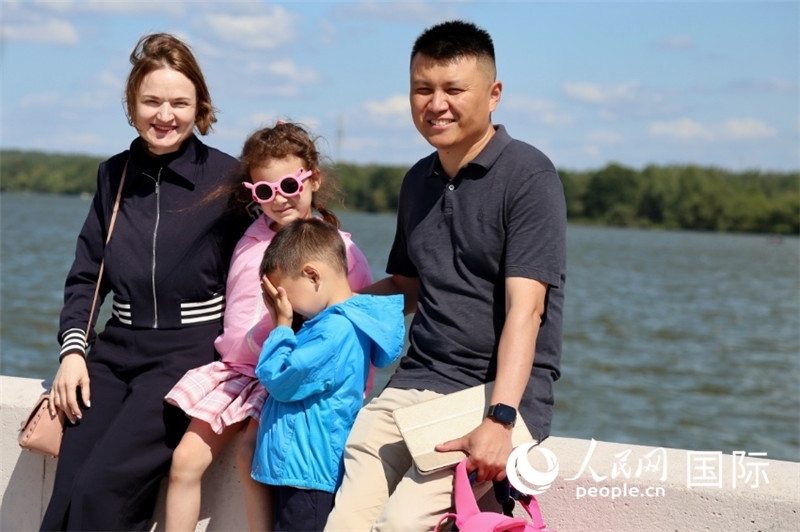 邢亮與妻子娜斯佳還有孩子們在湖邊散步。人民網(wǎng)記者 朱虹攝