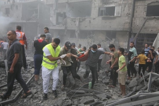 10月12日,在加沙地帶南部城市汗尤尼斯,人們?cè)谠庖陨锌找u后的建筑廢墟中抬出遇難者遺體。新華社發(fā)(亞西爾·庫(kù)迪攝)