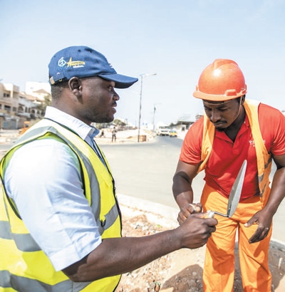 ?塞內(nèi)加爾達(dá)喀爾快速公交項目是塞內(nèi)加爾第一條城市快速公交線路。這條長約18公里的道路將穿過達(dá)喀爾人口密度最高的社區(qū)和核心商務(wù)區(qū),建成后有助于緩解首都交通壓力。圖為當(dāng)?shù)貑T工在項目建設(shè)工地交流。新華社記者 李亞輝攝