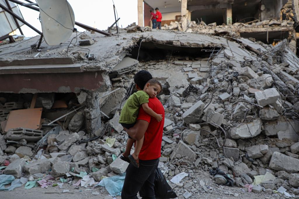 10月16日,在加沙地帶南部城市汗尤尼斯,人們從遭以色列空襲損毀的建筑廢墟前走過。新華社發(fā)(里澤克·阿卜杜勒賈瓦德攝)
