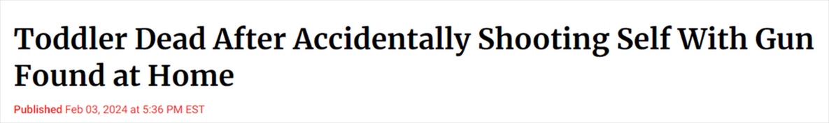 美國疾病控制與預(yù)防中心(CDC)的數(shù)據(jù)顯示,“意外傷害是造成美國0至17歲未成年人死亡的主要原因,而槍支是主要的傷害方式”,其中超半數(shù)的意外槍擊事件發(fā)生在家中。
