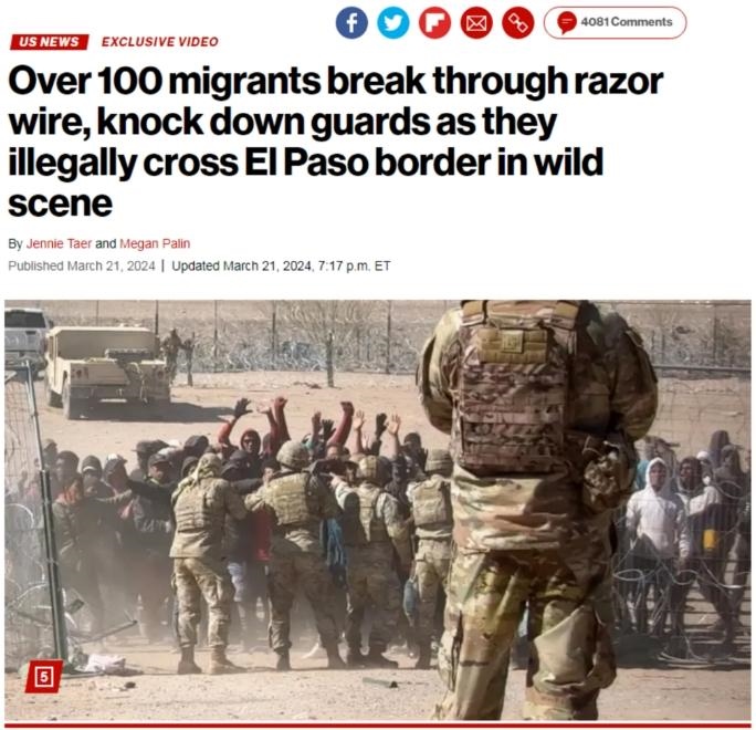 中新網3月22日電 綜合外媒報道,當地時間21日,在得克薩斯州邊境墻附近,有上百名非法移民沖破鐵絲網試圖非法進入美國。他們撞倒得州國民警衛(wèi)隊成員,試圖越過美墨邊境,場面一度十分混亂。