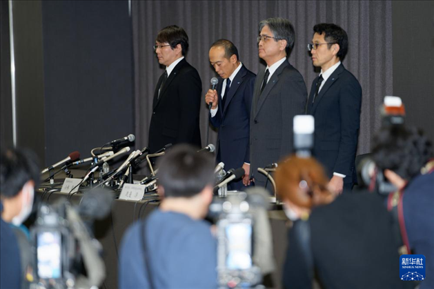 3月29日,小林制藥公司社長(zhǎng)小林章浩(左二)及相關(guān)負(fù)責(zé)人在日本大阪舉行的新聞發(fā)布會(huì)上鞠躬。新華社記者 張笑宇 攝