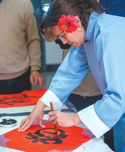 安雅在學(xué)校為留學(xué)生舉辦的新春活動(dòng)上用毛筆書寫“?!弊帧J茉L者供圖