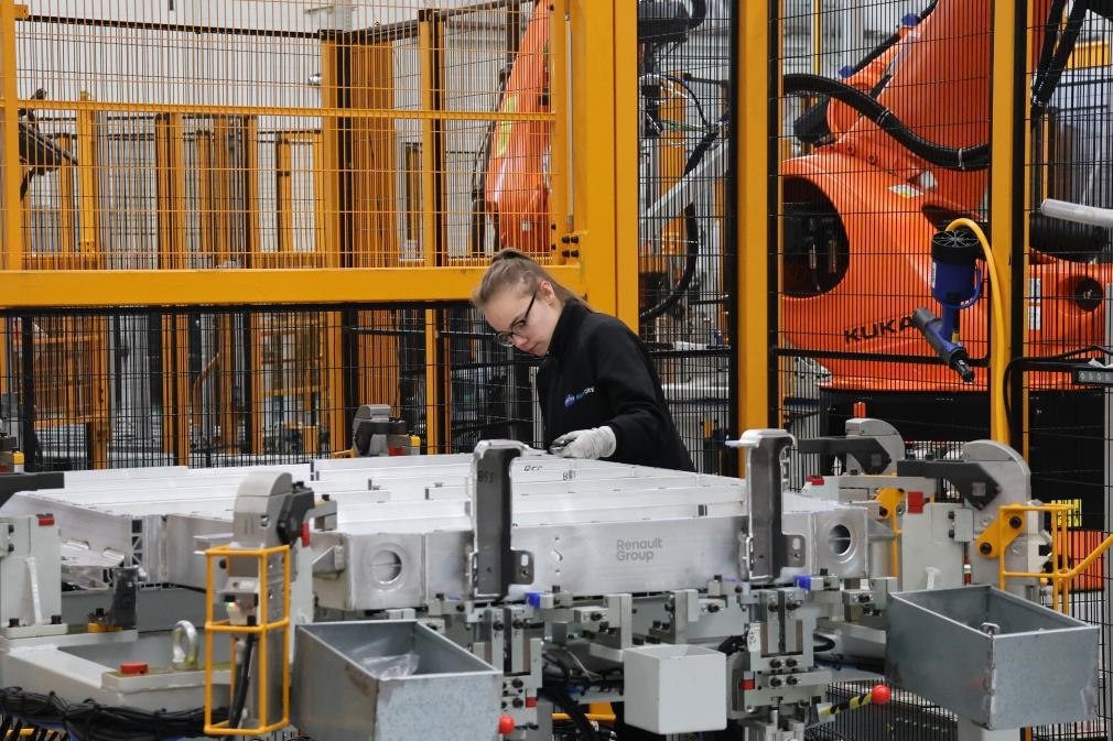 ?2月23日,在法國呂茨,中國敏實(shí)集團(tuán)與法國雷諾集團(tuán)成立的合資公司的員工在電池盒產(chǎn)線上工作。新華社記者張百慧攝