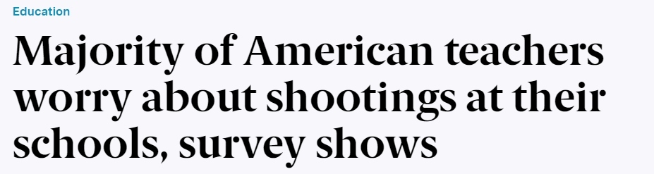 報道稱,2023年,美國發(fā)生的校園槍擊事件數(shù)量達(dá)到了歷史新高。在接受皮尤調(diào)查的受訪者中,59%的人對校園槍擊表示擔(dān)心,其中18%的人說自己對此感到“非?!被蛘摺皹O度”擔(dān)心。只有7%的受訪教師稱,他們完全不擔(dān)心校園槍擊的發(fā)生。