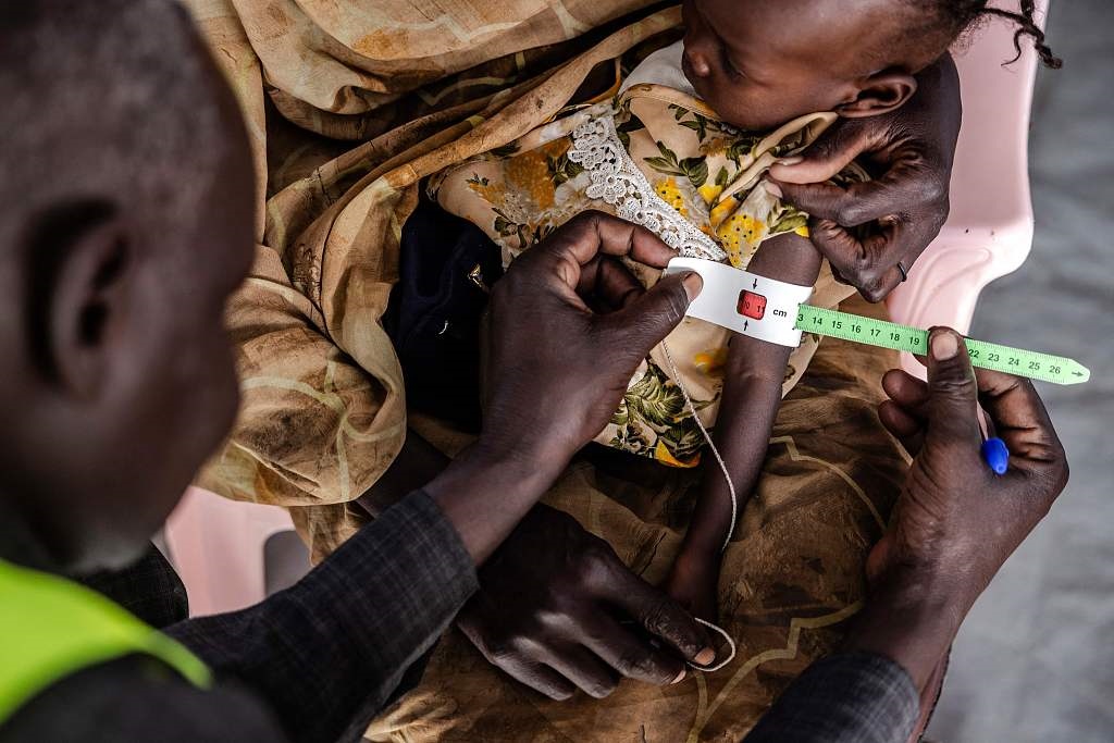 當(dāng)?shù)貢r(shí)間2024年2月13日,南蘇丹,在難民中轉(zhuǎn)中心的診所里,一名醫(yī)護(hù)工作人員在測量一名蘇丹兒童的手臂周長。