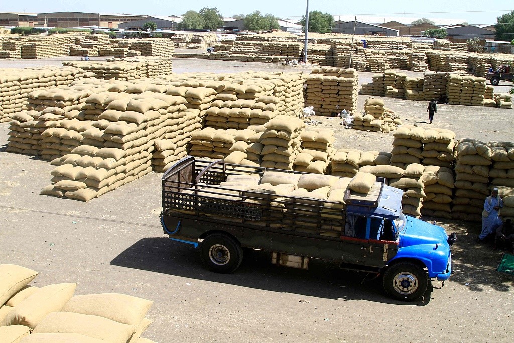 當(dāng)?shù)貢r(shí)間2024年2月22日,蘇丹東部杰達(dá)雷夫市,卡車在一個(gè)市場里運(yùn)送谷物。聯(lián)合國糧食計(jì)劃署表示,蘇丹長期武裝沖突導(dǎo)致當(dāng)?shù)亟^大多數(shù)人都面臨饑餓。