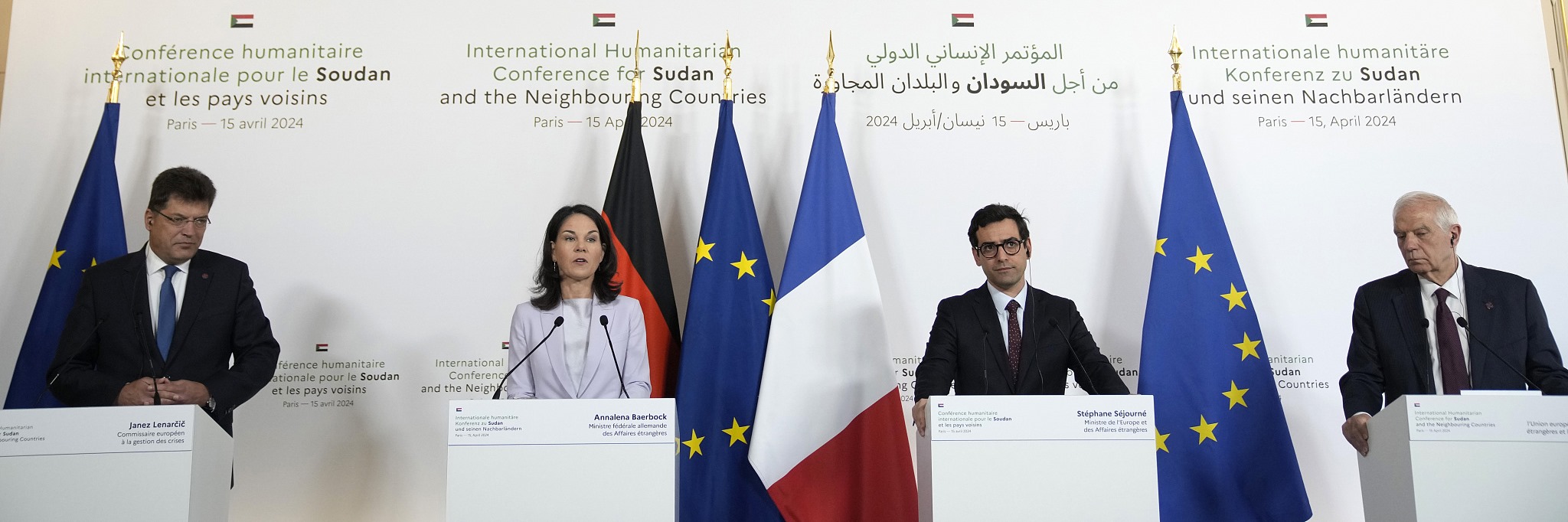 當(dāng)?shù)貢r(shí)間2024年4月15日,法國巴黎,法國外交部長斯特凡納·塞茹爾內(nèi)(右二),德國外交部長安娜萊娜·貝爾伯克,歐盟危機(jī)管理專員約翰·萊納西奇(左)和歐盟外交與安全事務(wù)高級代表何塞普·博雷利參加了蘇丹及其鄰國國際人道主義會(huì)議的聯(lián)合新聞發(fā)布會(huì)。