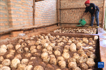 4月6日,在盧旺達(dá)南方省穆漢加市附近,尼揚(yáng)博·奧貝德在工坊查看培育的蘑菇。 新華社記者 董江輝 攝