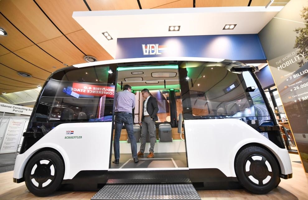 ?4月23日,人們?cè)诘聡?guó)漢諾威工博會(huì)上參觀一款無(wú)人駕駛汽車(chē)。新華社記者任鵬飛攝