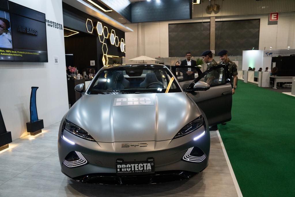 ?4月4日,在巴西圣保羅舉行的巴西防務(wù)展上,參觀者體驗(yàn)一輛經(jīng)過(guò)防彈加固的比亞迪海豹電動(dòng)汽車(chē)。新華社記者王天聰攝
