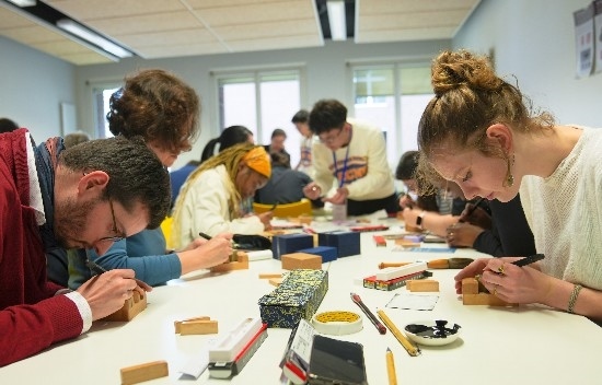 當(dāng)?shù)貢r(shí)間5月2日,在巴黎東方語(yǔ)言文化學(xué)院內(nèi),華東師大美術(shù)學(xué)院崔樹(shù)強(qiáng)教授與教育部中華優(yōu)秀傳統(tǒng)文化篆刻傳承基地主任張索教授、顧琴教授帶領(lǐng)書法篆刻碩士研究生杜家航、程羽瑄、蔡崢指導(dǎo)巴黎東方語(yǔ)言文化學(xué)院師生進(jìn)行書印體驗(yàn)。